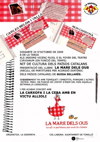 Aquest dissabte al vespre es celebra una Nit de Cultura dels Països Catalans al 'foyer' del teatre Cirvianum de Torelló. Dins lacte es presentarà el llibre La mare dels ous de Guida Sellarès, un recull de partitures dacordió diatònic.