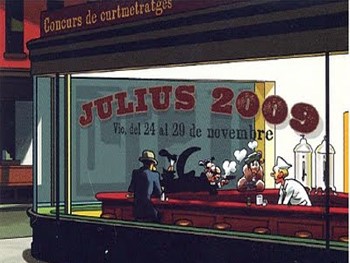 La competició del Julius 2009 s'ha fet aquest dissabte a la tarda a partir de les quatre amb una primera projecció dels curtmetratges que participen enguany al concurs. Una edició que des de lorganització sapunta per una gran varietat i novetats en els formats (mp4) i suports (mòbil, càmera fotogràfica) i per una durada menor de les peces, el que ha permès poder-ne entrar més en cadascun dels quatre passis. El tema daquesta edició és la pintura dEdward Hoper, Nighthawks, de lany 1942.