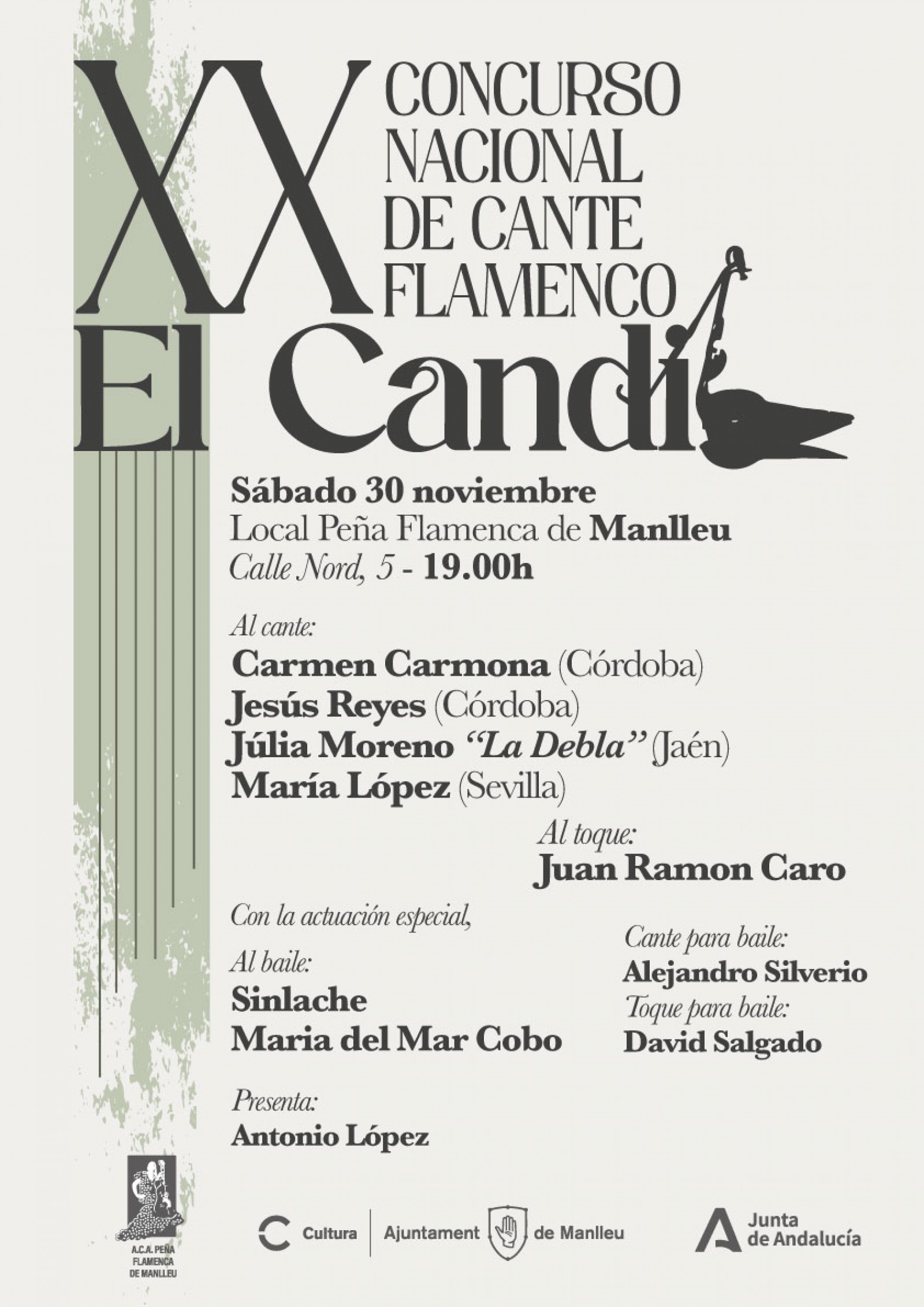 La jornada tindrà una actuació especial de Sinlache i Maria del Mar Cobo, que ballaran mentre Alejandro Silverio al cante i David Selgado al baile acompanyaran l’espectacle.