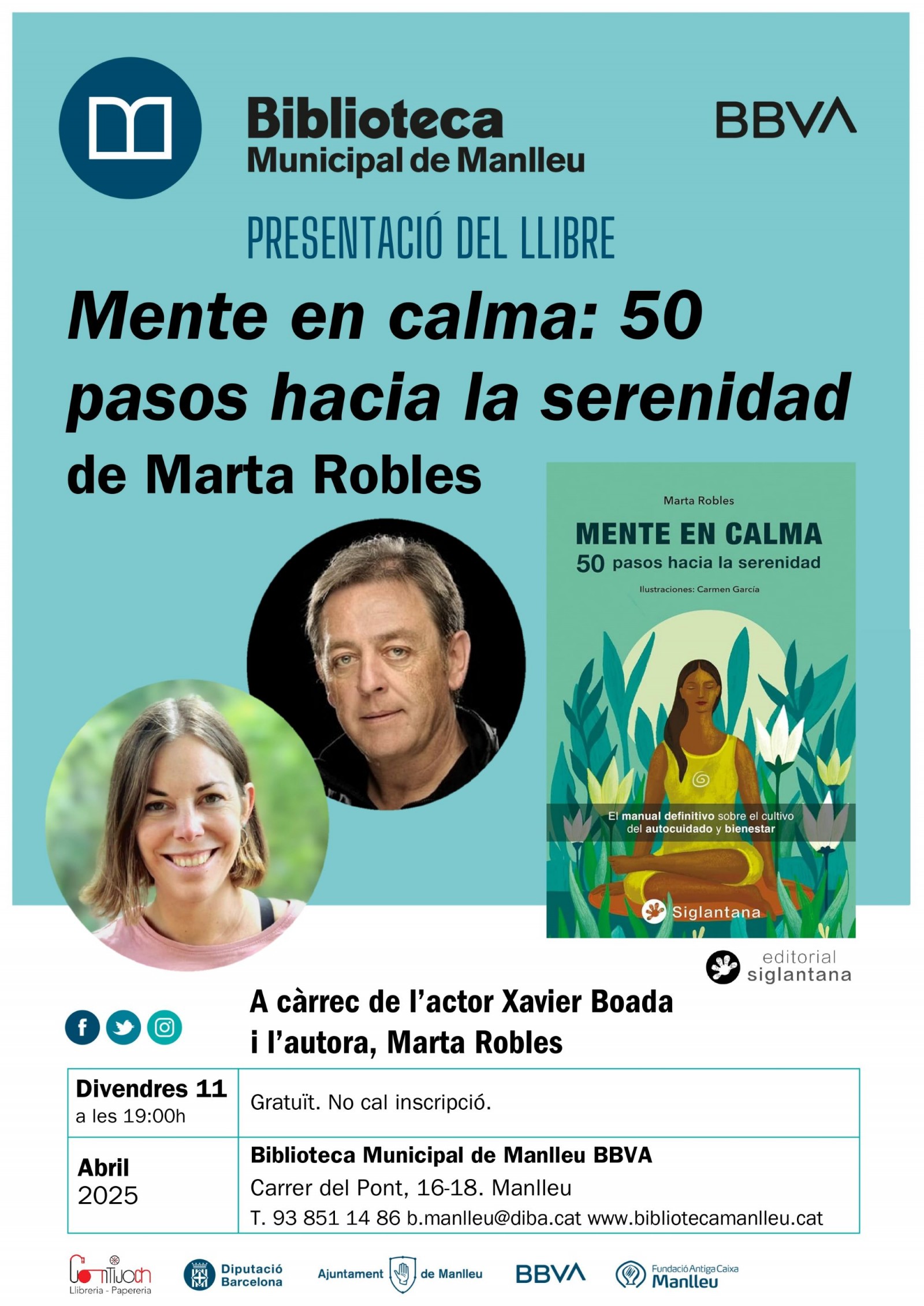 divendres, 11 d’abril a les set de la tarda a la Biblioteca Municipal de Manlleu. La presentació anirà a càrrec de Xavier Boada, actor i amic de l’autora. Durant l’acte conversaran i donaran pautes per fer una petita pràctica de meditació. La presentació comptarà amb la presència de la Llibreria Contijoch, que vendrà exemplars del llibre.