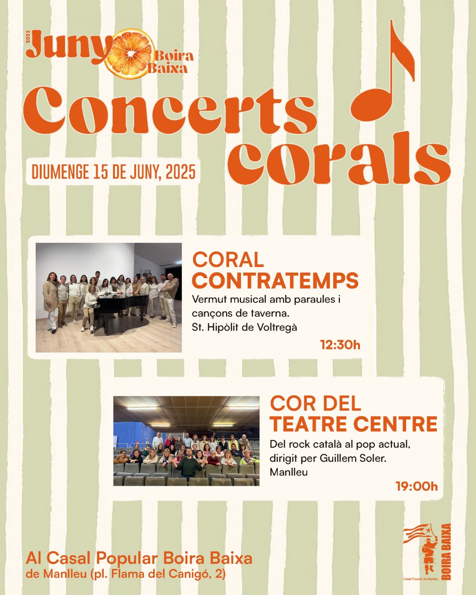 El proper diumenge, 15 de juny, el Casal Popular Boira Baixa acollirà dos concerts corals. En primer lloc, la Coral Contratemps de St. Hipòlit de Voltregà, que obsequiarà el públic amb un tastet de cançons de taverna a l'hora del vermut, a 2/4 d'1 del migdia; a les 7 de la tarda, serà el torn del gran Cor del Teatre Centre de Manlleu dirigit per Guillem Soler, que presentarà el seu nou espectacle, que va del rock català al pop actual passant per Mar i Cel o el clàssic "Stand by me".