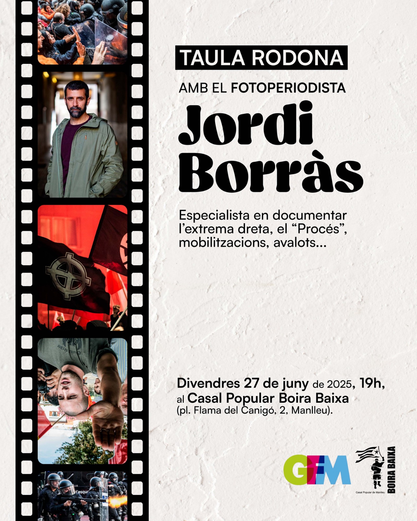 Jordi Borràs participarà en una taula rodona organitzada pel Grup Fotogràfic Manlleu. Borràs, especialitzat a documentar fotogràficament l'extrema dreta, el Procés i tota mena de mobilitzacions i avalots, farà un repàs d'alguns dels seus principals projectes i reportatges.
