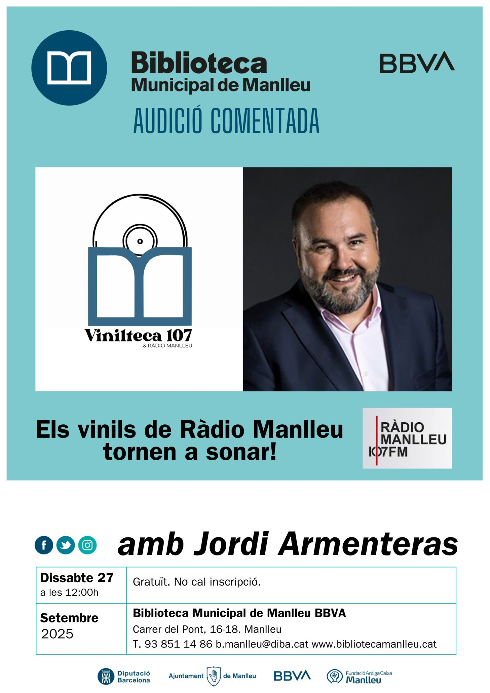 La Biblioteca Municipal de Manlleu BBVA comença un cicle d’audicions amb discos de vinil: la Vinilteca 107. La biblioteca té un fons procedent de Ràdio Manlleu que correspon als discos de vinil acumulats durant 30 anys a Ràdio Manlleu. El fons és molt variat d’estils musicals, però és tot un reflex cultural dels anys 80 o 90 sobretot. Té música de tipus radio fórmula i de programes específics que s’emetien a l’emissora: rock, flamenc, sardanes, etc.