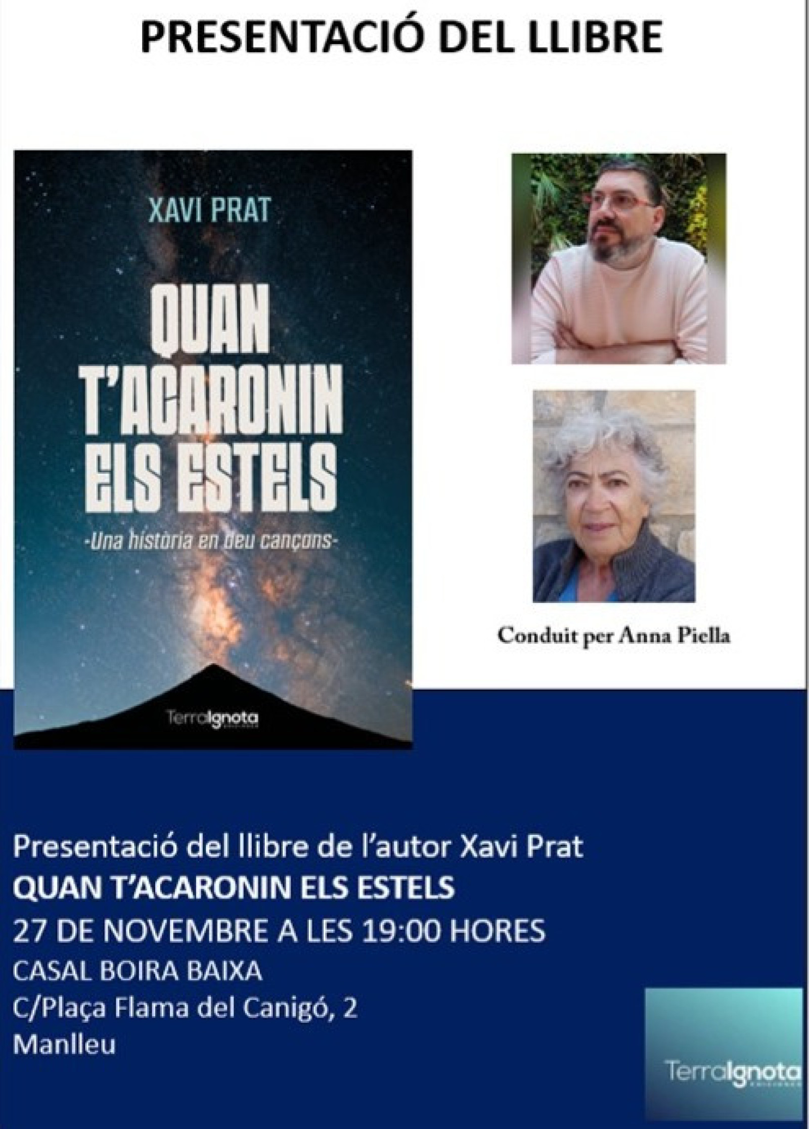 Quan t'acaronin els estels. Una història de deu cançons, de Xavi Prat. L'obra "aborda el dol i la pèrdua des d'una perspectiva íntima i poètica, amb capítols inspirats en cançons que en marquen el fil conductor". L'acte serà conduït per la manlleuenca Anna Piella.