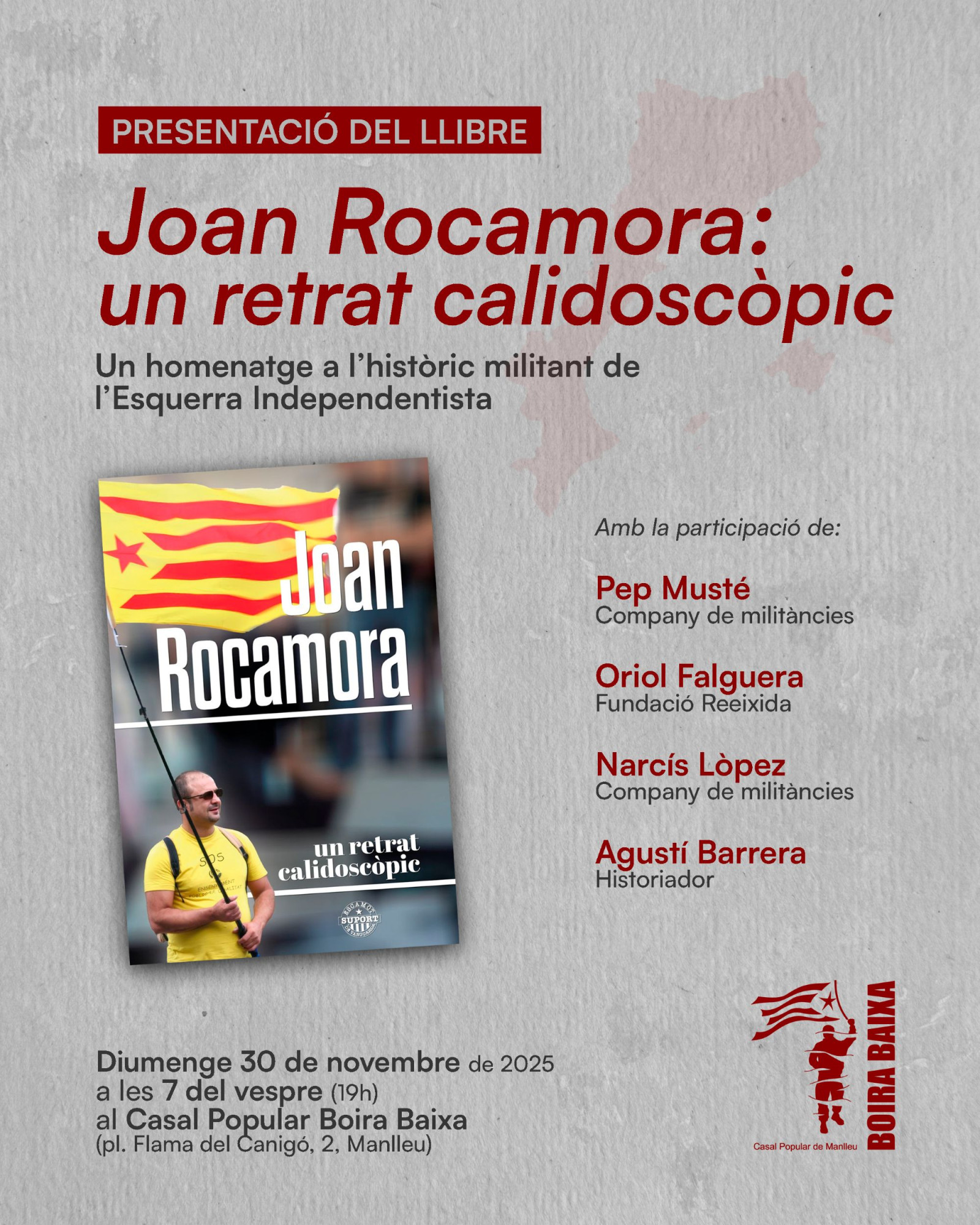 Joan Rocamora: un relat calidoscòpic és un homenatge a l'històric militant de l'Esquerra Independentista. L'acte comptarà amb la participació de Pep Musté, Narcís Lòpez, Oriol Falguera, membre de la Fundació Reeixida, i l'historiador Agustí Barrera. L'obra repassa la trajectòria de Rocamora, qui va morir l'any passat. Va compaginar la recerca acadèmica amb una "militància tenaç i discreta" i va ser membre de Terra Lliure, del Moviment de Defensa de la Terra, de l'Assemblea Nacional Catalana i de la CUP. També va col·laborar també com a articulista en diversos mitjans.