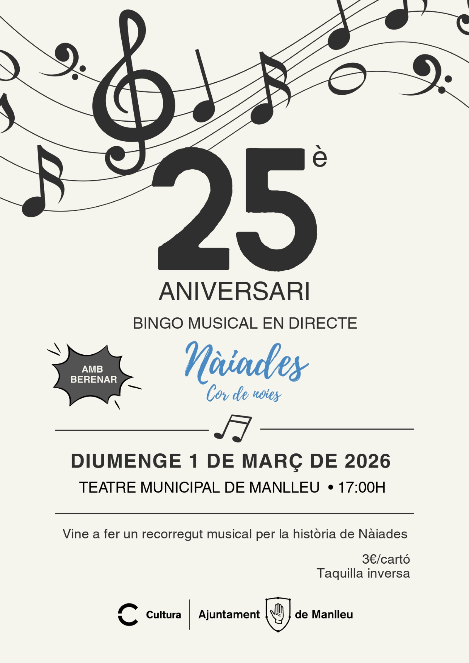 Per celebrar els seus 25 anys, Nàiades-Cor de noies ha organitzat un concert especial pel pròxim diumenge, 1 de març, a les cinc de la tarda al Teatre Municipal de Manlleu. Un bingo musical en directe en què s'interpretaran fragments d'algunes obres que han interpretat al llarg de la seva trajectòria.
