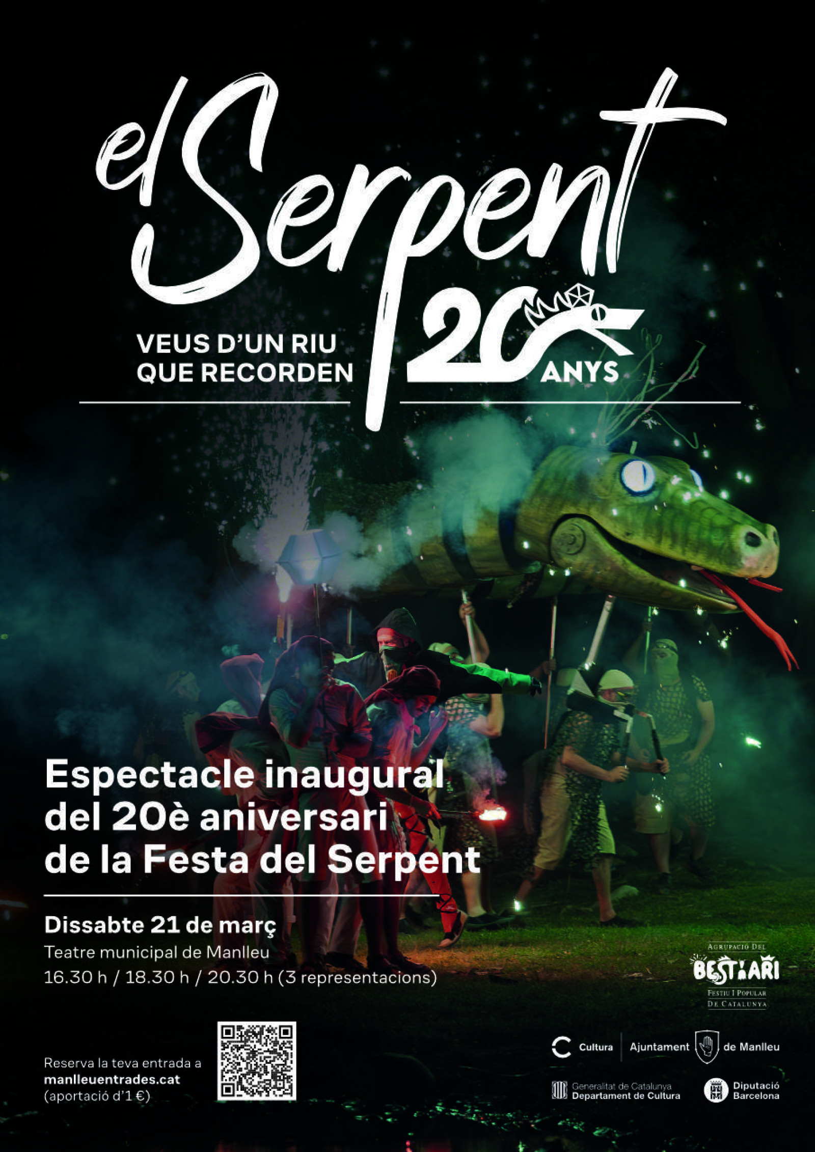 La Festa del Serpent de Manlleu celebrarà el seu vintè aniversari amb l’espectacle El Serpent: veus d’un riu que recorden, una proposta escènica que repassarà dues dècades d’història d’aquesta celebració de cultura popular. L’acte tindrà lloc dissabte 21 de març al Teatre Municipal de Manlleu, amb tres sessions programades a les 16.30 h, 18.30 h i 20.30 h.