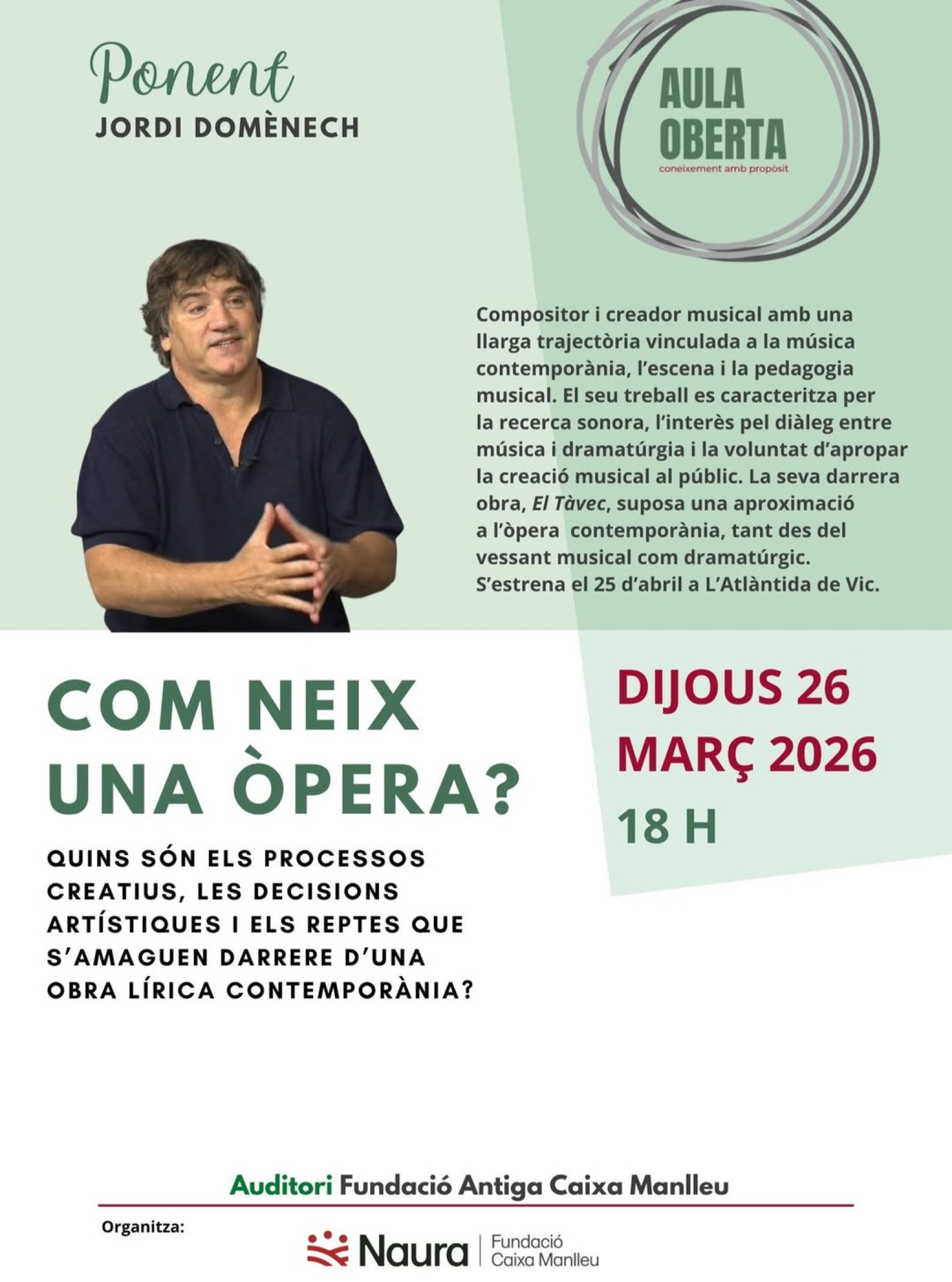 Naura-Fundació Caixa Manlleu ha organitzat una nova sessió del cicle d'Aula Oberta, centrada en la creació d'una òpera. Tindrà lloc a l'Auditori Fundació Antiga Caixa Manlleu el dijous 26 de març, a les sis de la tarda.