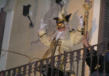 El rei Carnestoltes XXXI, el 2009, brandant el Falatell des del balcó de l'Ajuntament, just després del cop d'estat