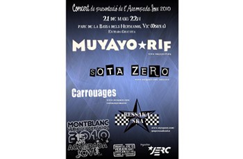 La presentació de lAcampada Jove 2010 tindrà lloc, a patir de les 10 de vespre, al Parc de la Bassa dels Hermanos de Vic. Els assistents podran gaudir dun concert gratuït amb els grups musicals Muyayo Rif i Sota Zero. També actuaran els locals Carrouages i Ressaka Ska que participaran del concurs Música Jove.