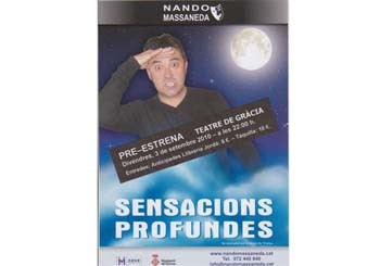 Sota el títol Sensacions profundes samaga un noi que senfonsa en la seva pròpia decadència de linconscient, una tragèdia on el públic espectador shi sentirà identificat. Nando Massaneda és l'actor que dóna vida a l'obra. Ell mateix la defineix com 'una comèdia en format monòleg amb una escenografia minimalista'.
