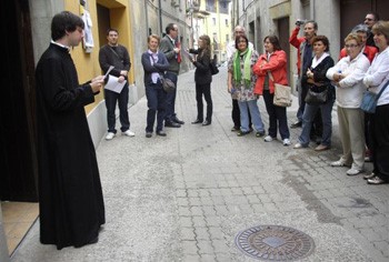 Un moment de la ruta, amb un actor donant vida al manlleuenc Joan Puntí i Collell, al carrer del Comte