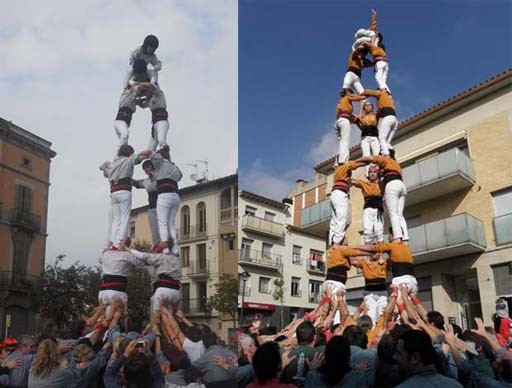 A l'esquerra, els Nyerros de la Plana en una actuació a Manlleu i a la dreta el Sagals d'Osona a Calders