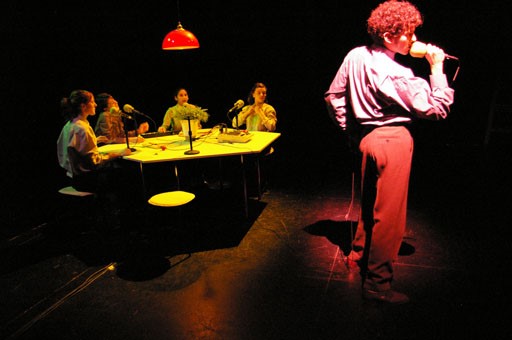 Els 5 personatges es converteixen en comunicadors que parlen a través de cançons i textos literaris. Tot plegat per saber si hi ha algú que laltra banda que els està escoltant. Lescenografia recrea un locutori radiofònic. Tot i que no ho ha canvis físics, al llarg de lobra latmosfera va canviant.
