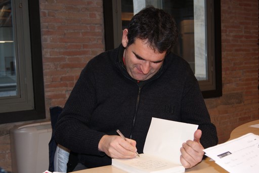 Jordi Puntí als estudis de Ràdio Manlleu, signant un exemplar