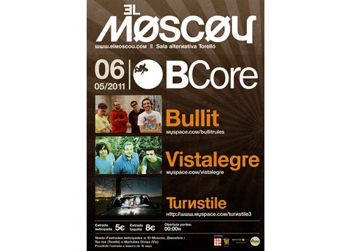El proper dia 6 de maig de 2011 a partir de les 12 de la nit, a la sala El Moscou de Torelló, es celebrarà la primera festa del segell discogràfic BCORE que comptarà amb l'actuació de Bullit, Vistalegre i Turnstile.