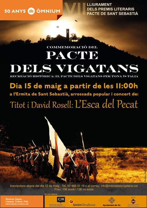 La jornada començarà a les 11 del matí. Hi haurà una ballada de gegants, lentrega dels VII Premis Literaris Pacte de Sant Sebastià, lencesa de la Flama del Pacte dels Vigatans i la interpretació de diversos himnes catalans. A la 1 del migdia hi haurà la recreació històrica, i seguidament el dinar. La presidenta d'Òmnium Cultural, Muriel Casals, clourà l'acte amb un petit discurs. La sobretaula comptarà amb lactuació de Titot i David Rosell amb lespectacle 'LEsca del Pecat'. El cartell d'enguany és una composició del dissenyador Xavier Esclusa Trias que fusiona una fotografia, feta pel periodista Joan Mill, amb material gràfic dels Miquelets de Catalunya.