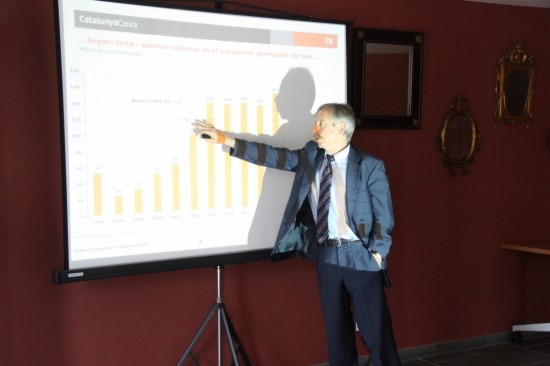 El director de l'Anuari Econòmic Comarcal de CatalunyaCaixa, Josep Oliver, durant la presentació a Mon Sant Benet