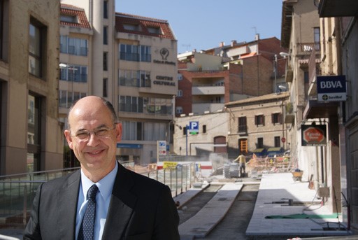 Xavier Queralt, aquest dimecres a Manlleu; de fons, l'edifici d'Unnim i a la dreta, l'emblema de l'oficina de BBVA