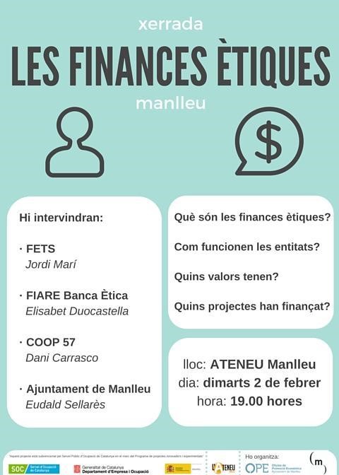 L'Ateneu acull aquest dimarts una xerrada sobre les finances ètiques. Algunes de les entitats de finances ètiques més representatives (Fets, FIARE, Coop57) explicaran com funcionen i quins tipus de projectes han finançat o es els reptes que es plantegen. L'acte es fa dins del projecte de dinamització i suport a l’economia social i solidària impulsat per l'Ajuntament de Manlleu.