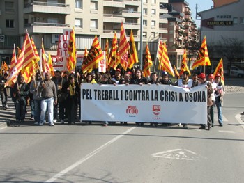 Més de 300 persones shan concentrat aquest matí a Vic en una manifestació convocada conjuntament pels sindicats UGT i CCOO. Els sindicats han reclamat a empresaris i administració mesures per pal.liar la crisi. També han demanat un pla de xoc per fer front a laugment de latur a Osona. Es calcula que durant aquest mes de febrer es podria arribar a superar la barrera dels 10.000 aturats.
