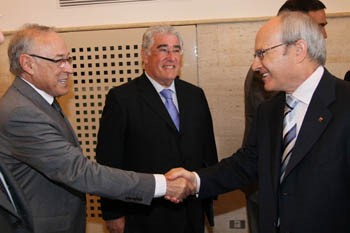 El manlleuenc Joan Contijoch, vicepresident segon d'Unnim, saludant el president Montilla. Foto: Jordi Bedmar