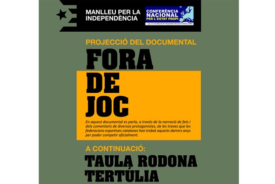 Aquest divendres a partir de 2/4 de 9 del vespre es projectarà a Manlleu el documental "Fora de joc", promogut per la Plataforma Pro Seleccions Esportives Catalanes, on es parla, a través de la narració de fets i dels comentaris de diversos protagonistes, de les traves que les federacions esportives catalanes han trobat aquests darrers anys per poder competir oficialment.