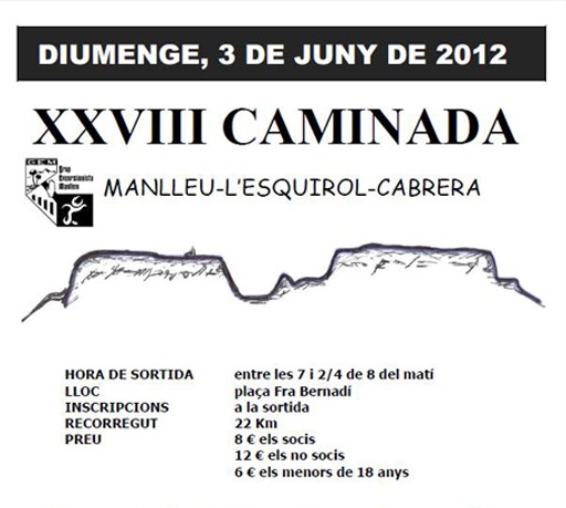 El proper diumenge dia 3 de juny es farà la caminada Manlleu lEsquirolCabrera organitzada pel Grup Excursionista Manlleu. Serà la 28a edició de la Caminada Manlleu Cabrera organitzada pel GEM.