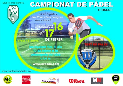 El club tennis Manlleu ha obert les inscripcions pel campionat de pàdel que es dura a terme entre el 16 i 17 de febrer. El torneig està dividit en tres categories per tal d'igualar els nivells dels participants ja que el campionat està obert a tothom. Tots els inscrits jugaran un mínim de 3 partits que hauran de superar per poder passar ronda ja que el campionat es realitzarà per eliminatòria.