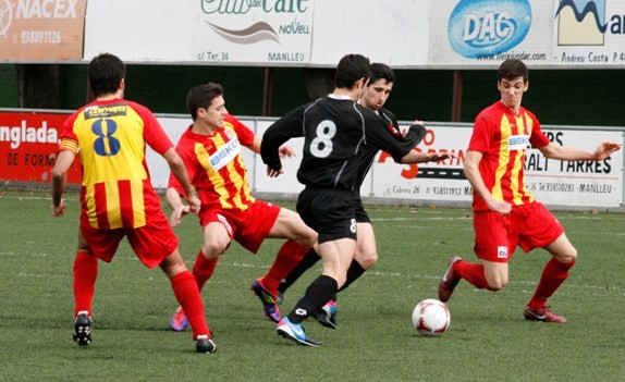 El partit ha començat amb el conjunt local tancant els de Jordi Dot al seu camp però sense convertir el domini de l'esfèrica en ocasions de gol. Malgrat les poques faltes realitzades pels manlleuencs les targetes grogues no han tardat en arribar. Al minut 12 Ramon Masó n'ha vist una per tallar un contraatac i al minut 32 la segona per impedir un servei de banda. Amb inferioritat al terreny de joc el Manlleu ha sacrificat part del joc d'atac fent entrar Masoliver en substitució d'Iván Guzmán. Els visitants han resistit durant la resta de la primera part a l'espera d'un segon període decisiu.