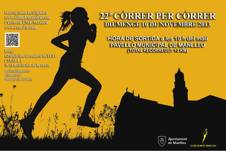 La cursa és gratuïta per a tots els participants que s'inscriguin abans del dia 9 de novembre i 3 el mateix dia de la cursa. Es tracta duna prova de 10 kms amb sortida i arribada al Passeig del Ter, pista d'atletisme. La Córrer per córrer lorganitza el Club Olímpic Manlleu.