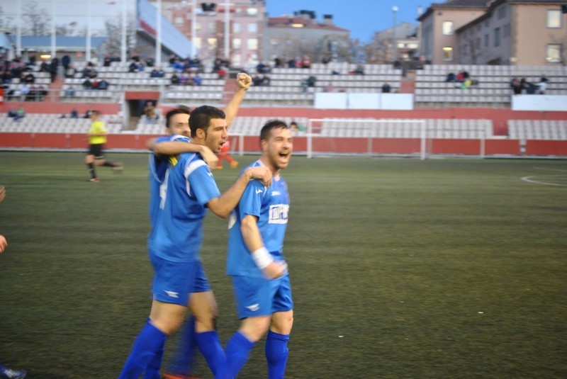 Manel Sala celebrant el primer gol amb els seus companys. Foto:Viuelmanlleu