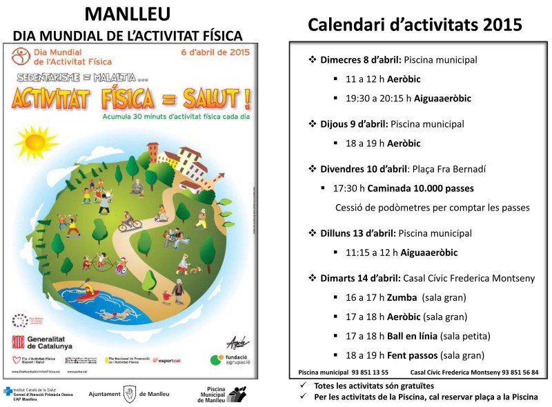 El centre dAtenció Primària de Manlleu i el Servei dEsports de lAjuntament de Manlleu han volgut compartir i sumar-se al dia de lActivitat Física, comptant amb la col·laboració del Casal Cívic Frederica Montseny. Per aquest motiu shan organitzat diverses activitats durant tota la setmana, tant al Casal com a la Piscina Municipal de Manlleu.