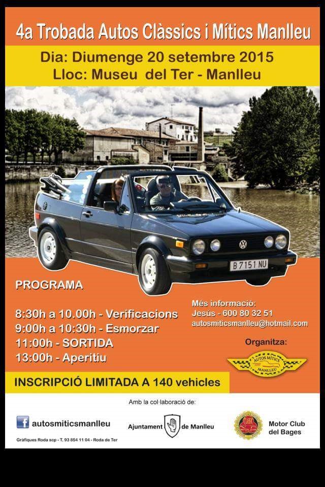 Manlleu té aquest diumenge, al matí, una retrobada amb el món dels vehicles clàssics i mítics. Enguany es celebra la quarta edició de la Trobada d’Autos Mítics i Clàssics de Manlleu. Es tracta d’una trobada que aplegarà més d’una cinquantena de vehicles històrics i mítics que han marcat una època. La cita amb el motor està prevista que dona el tret de sortida al punt de 2/4 de 9 del matí.