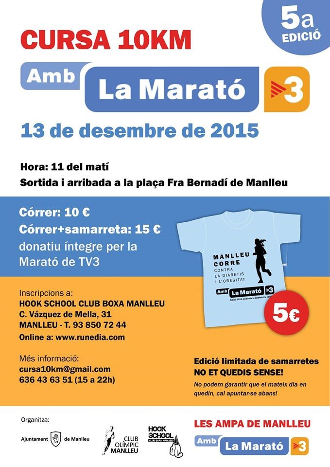 Un dels actes també destacats i que aporta més participació, és la cursa de 10Km que ha organitzat el Club Olímpic Manlleu juntament amb el Hook School Boxa Manlleu. El preu de l’inscripció és de 10 de euros i també es vendran unes samarretes commemoratives per 5 euros.
