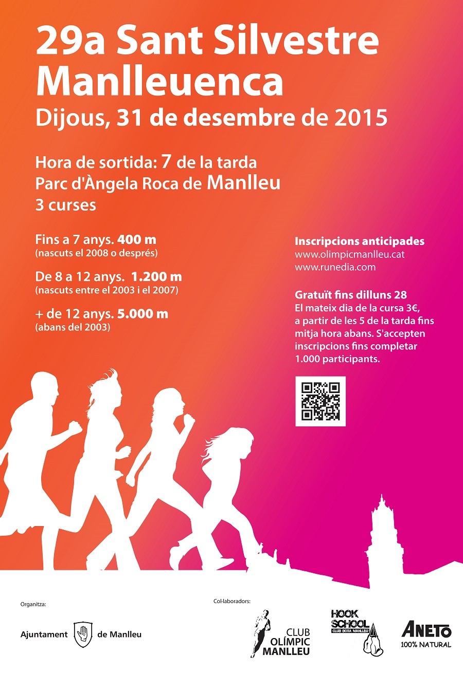 La 29a edició de la Sant Silvestre manlleuenca tancarà l’agenda d’activitats esportives del 2015. La cursa serà dijous 31 de desembre a les 7 de la tarda. El punt de sortida serà a l’Avinguda de Roma, prop del Parc Àngela Roca. La clàssica Sant Silvestre és una cursa popular, gratuïta i oberta a tothom, que s’ha convertit en el referent de les proves d'aquest tipus a la comarca.