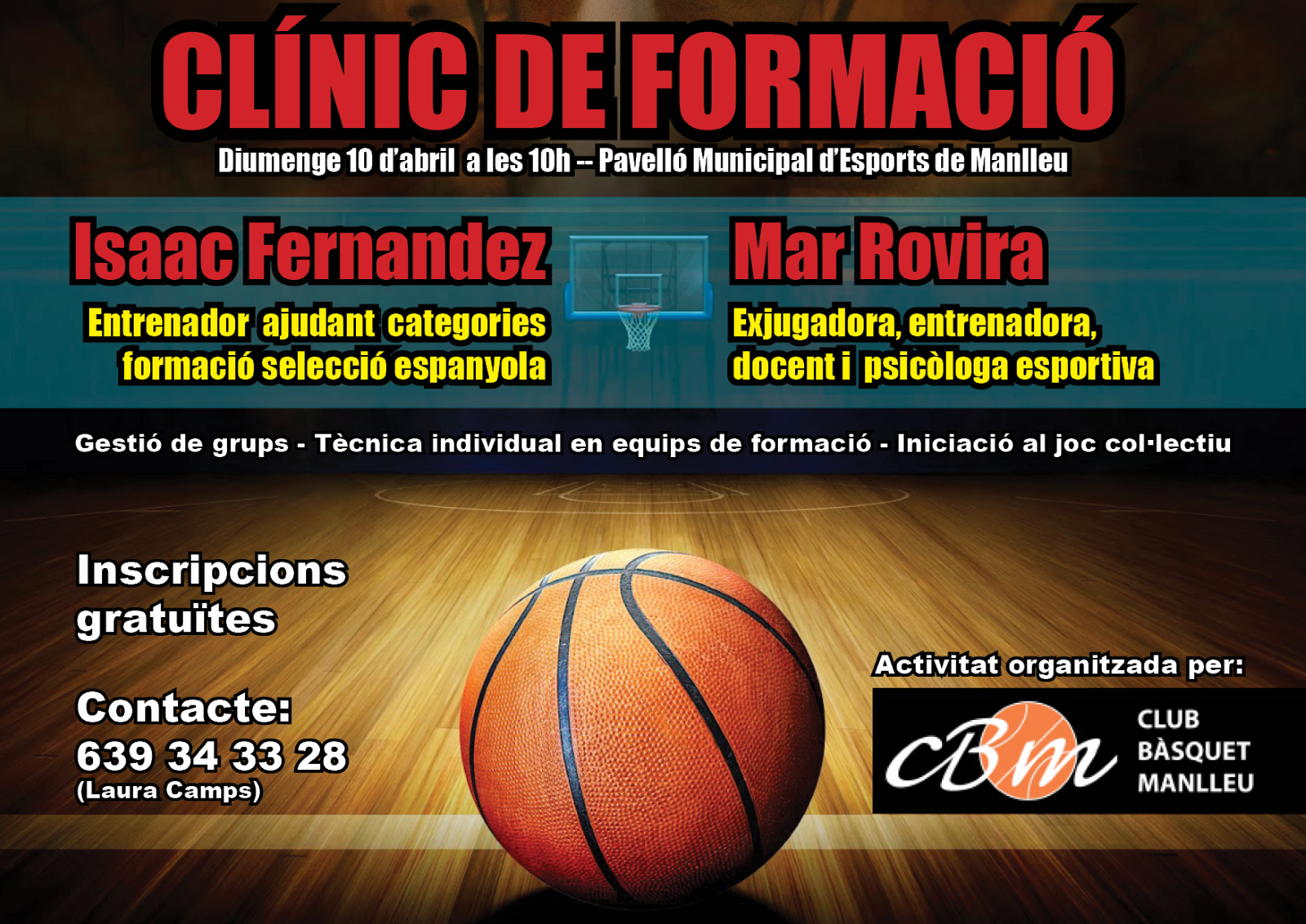 El Pavelló Municipal d’Esports de Manlleu acollirà aquest diumenge 10 d’abril (10h) un clínic de formació per entrenadors de bàsquet organitzat pel Club Bàsquet Manlleu i que comptarà amb la presència dels ponents Isaac Fernández i Mar Rovira.