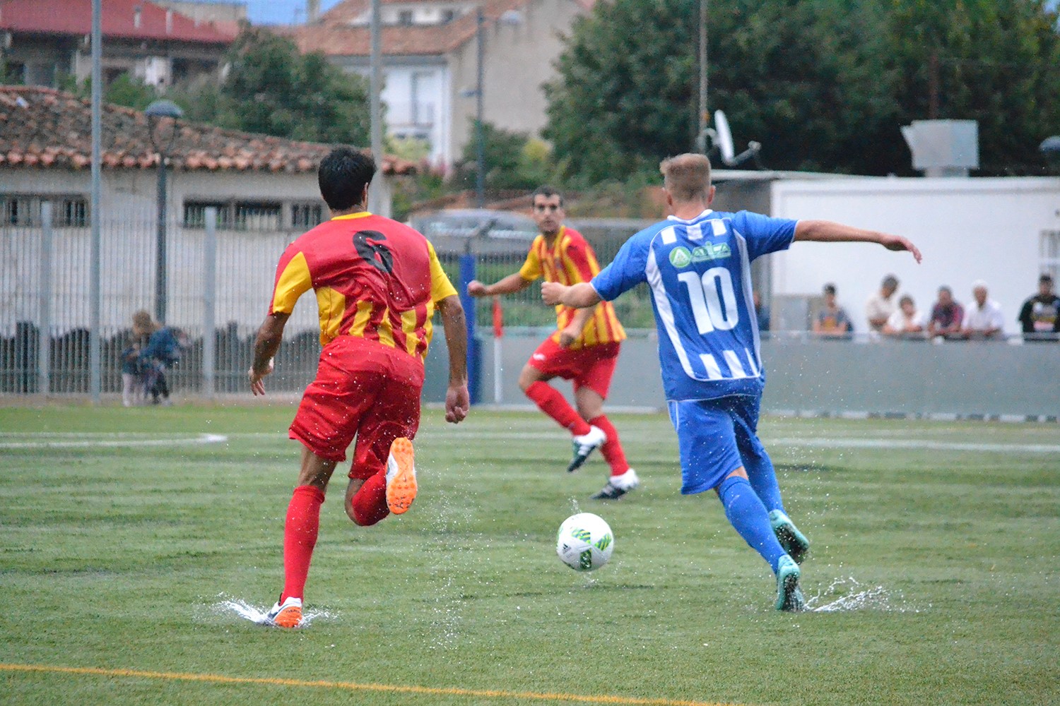 La tarda es va començar a tórcer quan el partit es va suspendre durant mitja hora a causa de la tempesta que va caure just quan els jugadors, a les 6 de la tarda, estaven a punt de començar l’enfrontament. El partit va estar a punt de no disputar-se però finalment el col·legiat va decidir tirar endavant, vint minuts després. Un fet que va condicionar molt el partit, segons comenta el tècnic manlleuenc Miquel Muñoz, a més aquesta vegada va elogiar l’actitud dels seus jugadors.