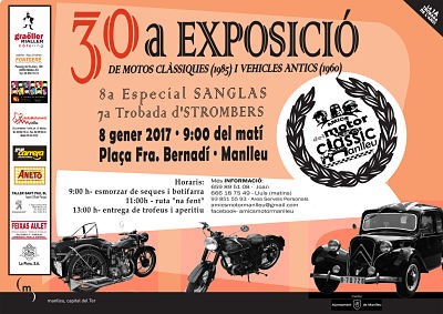 L’exposició de motos i cotxes antics celebrarà el diumenge 8 de gener el seu 30è aniversari. A partir de les 9 del matí més de 60 motos i 15 cotxes clàssics es reuniran a la Plaça Fra Bernadí de Manlleu.