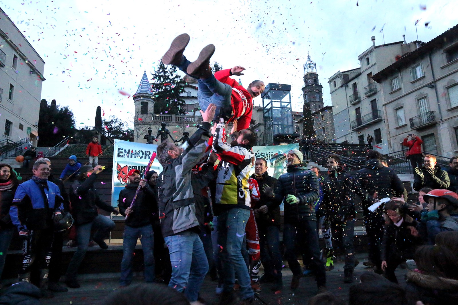 L’acte va acabar amb una mantejada del pilot de KTM on els seus amics van fer-li entrega d’una pancarta amb la signatura de tots els amics i pilots que van prendre part a l’esdeveniment.