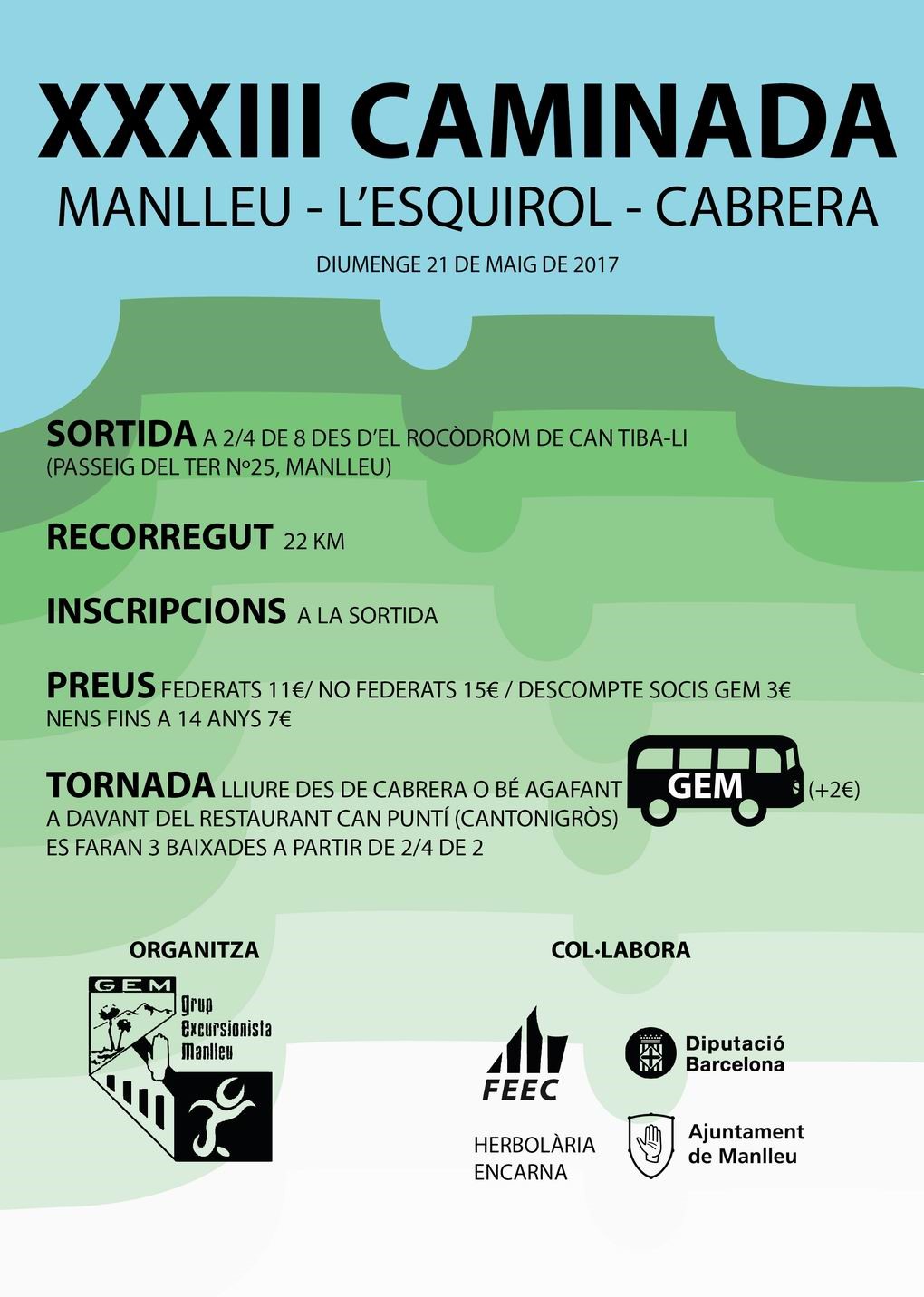 Aquest diumenge es celebra una nova edició de la nova caminada popular Manlleu – Cabrera. Enguany és la 33a edició de la mítica caminada organitzada pel Grup Excursionista Manlleu.