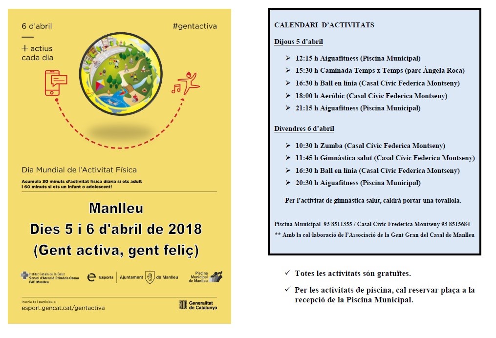 Les activitats estan organitzades pel Centre d’Atenció Primària de Manlleu, amb el Servei d’Esports de l’Ajuntament i la col·laboració del Casal Cívic Frederica Montseny i de l’Associació de la Gent Gran.