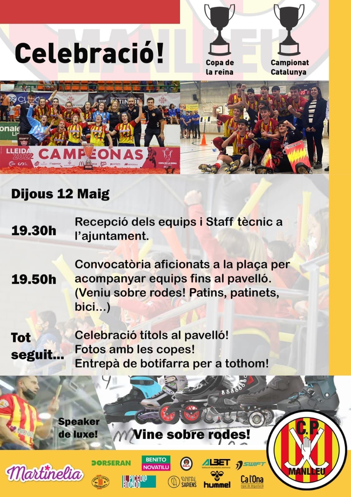 El reconeixement començarà a les 19:30h, amb la recepció del primer equip femení i el júnior masculí a l’Ajuntament de Manlleu, on els rebrà l’alcalde, Àlex Garrido. Més tard, quan faltin deu minuts per les 20h, començarà una rua d’aficionats des de la plaça Fra Bernadí fins al Pavelló Municipal d’Esports, on es convida a la gent a participar-hi amb patins, patinets o bicicletes. Una vegada la rua arribi a la zona esportiva, es farà la celebració dels títols, qui vulgui es podrà fer fotografies amb les copes i hi haurà una botifarrada.