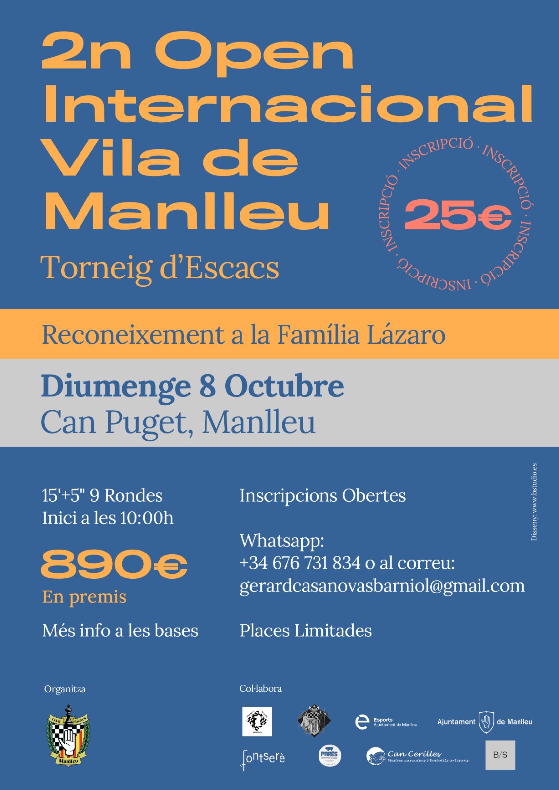 La capital del Ter serà l’epicentre dels escacs a la comarca el pròxim diumenge, 8 d’octubre, amb la celebració del 2n Open Internacional Vila de Manlleu d’escacs, que es farà a Can Puget.