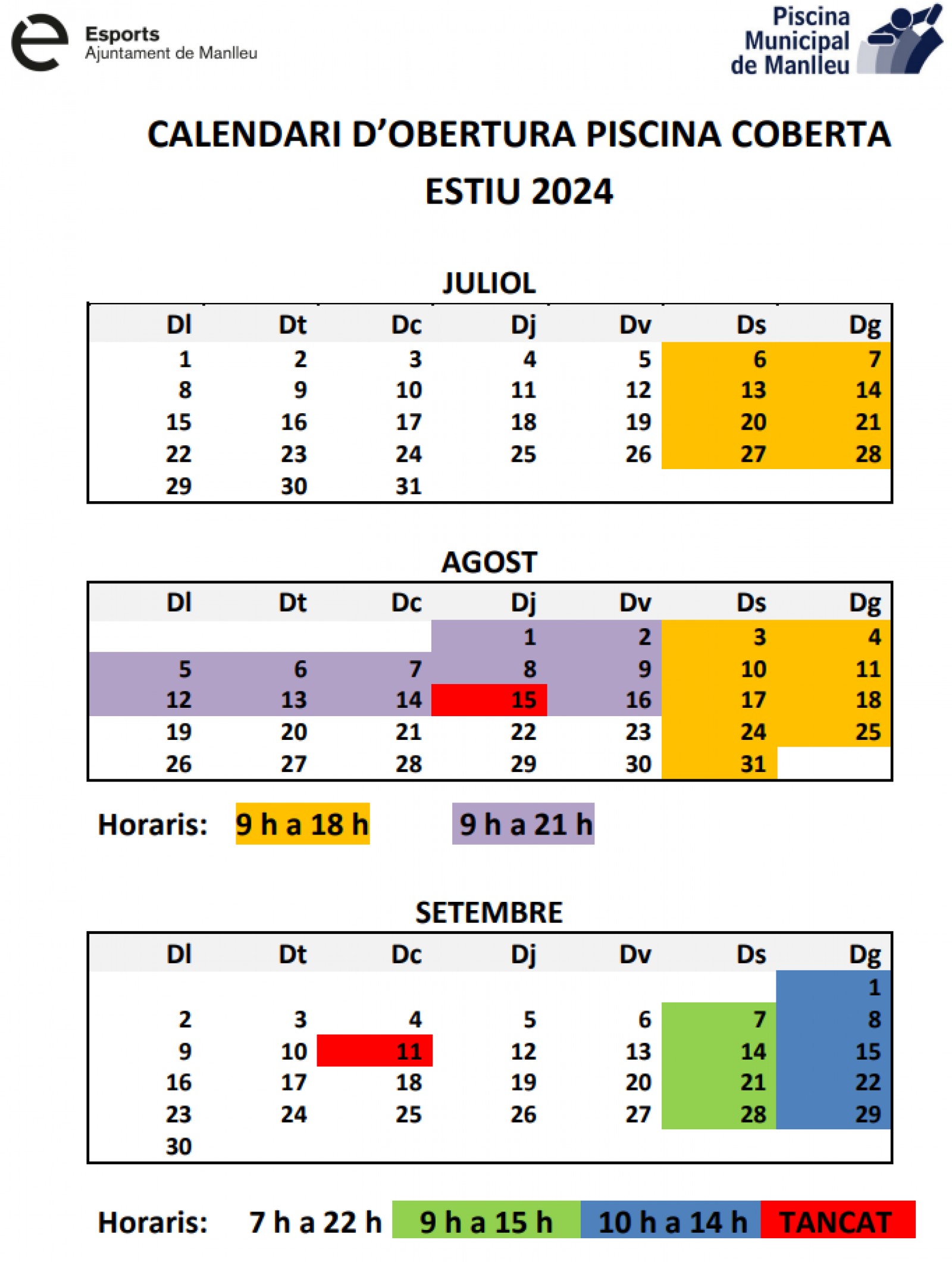 - De l’1 al 16 d’agost l'horari de la piscina serà de 9 a 21 h., essent festiu el 15 d'agost.