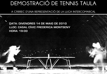 La demostració, que començarà a les 7 de la tarda d'aquest divendres a la sala polivalent del casal, anirà a càrrec duna representació de la lliga intercomarcal. Lacte serà el preludi del Torneig de Tennis Taula, que es farà a la plaça Fra Bernadí de Manlleu divendres de la setmana que ve, 21 de maig.