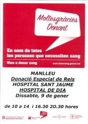 Aquest dissabte dia 9 de gener Manlleu acollirà la primera campanya de donació de sang de l’any. Una vegada més la unitat mòbil del Banc de Sang del Departament de Salut es situarà a l’espai de dia de l'hospital Sant Jaume.