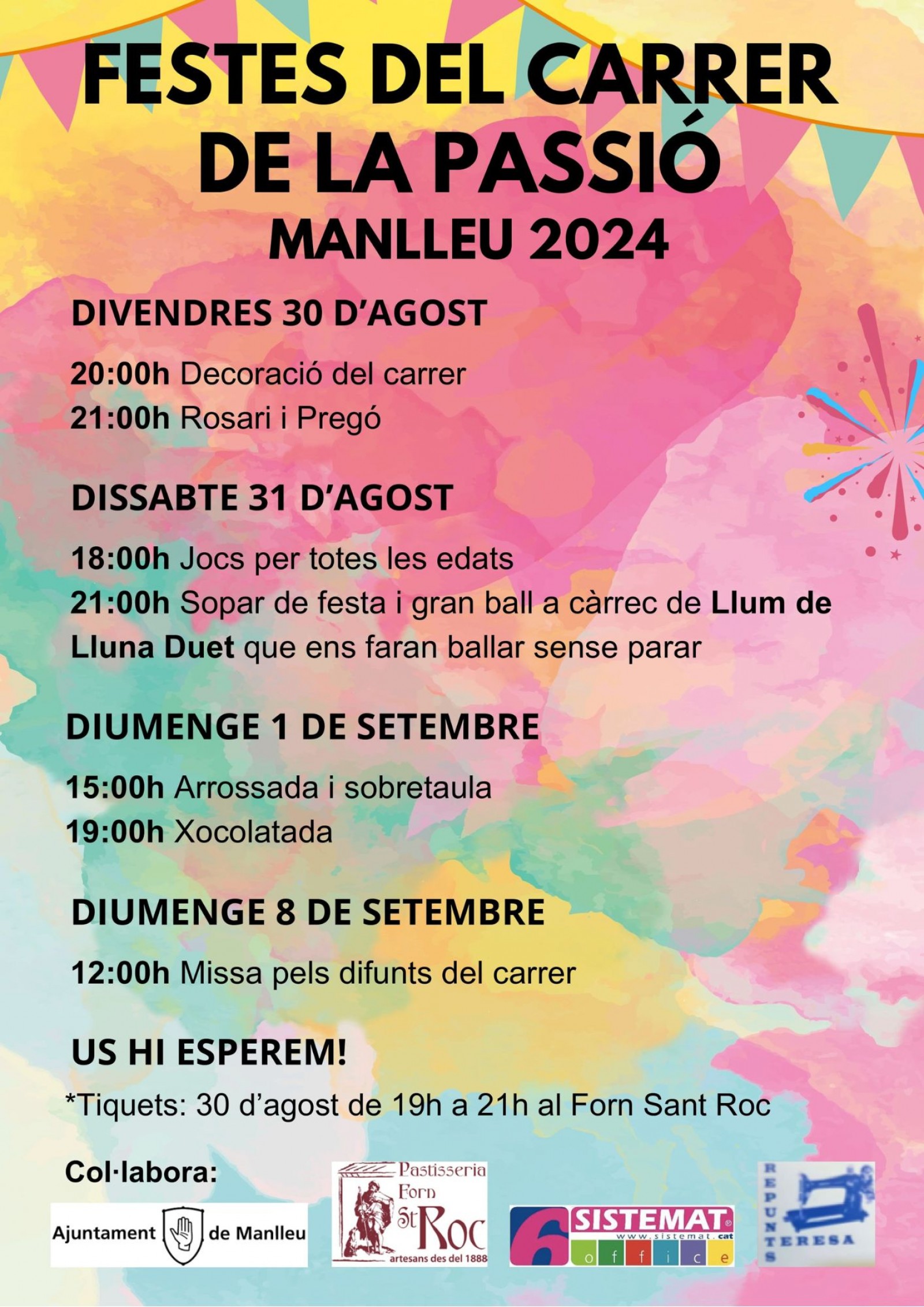 Els tiquets es podran adquirir divendres 30 d'agost, de 19 a 21 h, al Forn Sant Roc.