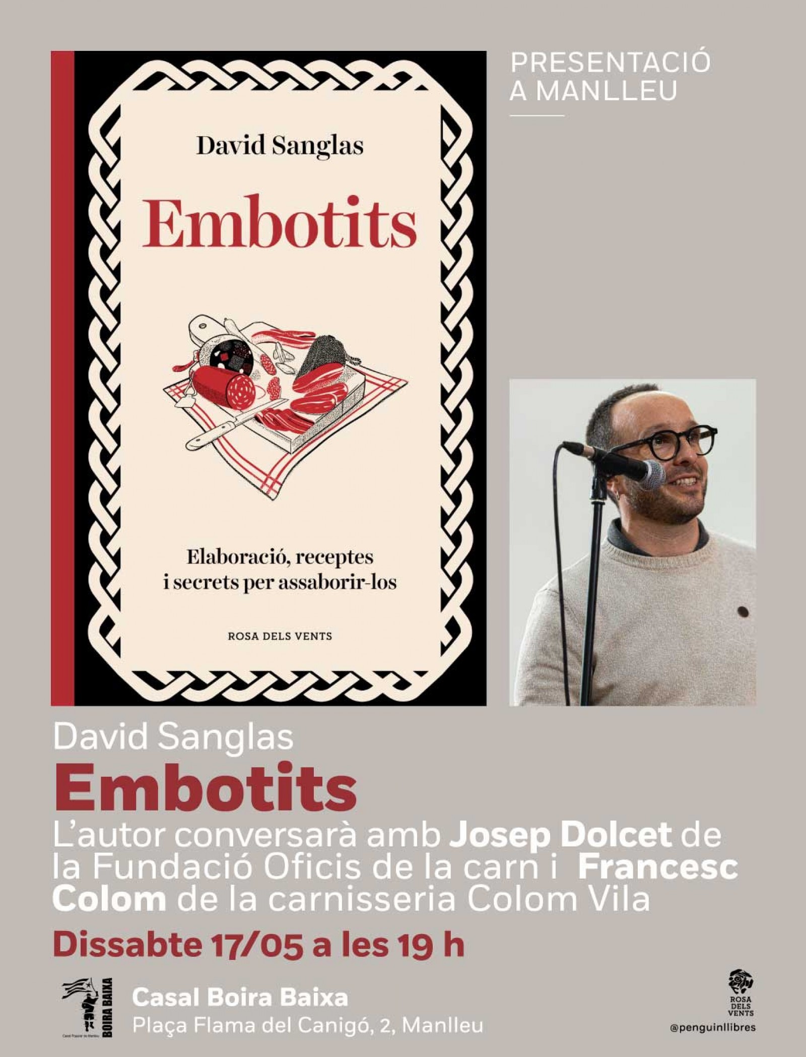 Embotits. Elaboració, receptes i secrets per assaborir-los al Casal Popular Boira Baixa. Durant l'acte, l'autor conversarà amb el carnisser Cesc Colom i amb Josep Dolcet, director i professor de l'Escola de Carn d'Osona.