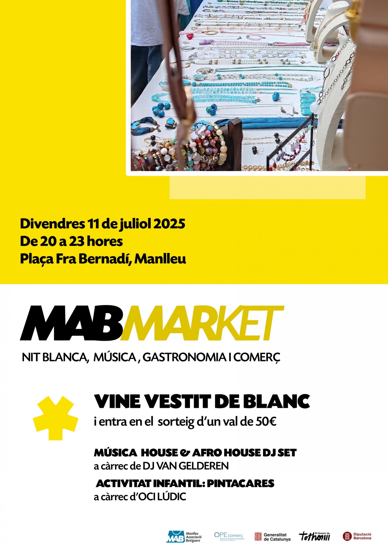 El divendres 11 de juliol, a partir de les vuit de la tarda, la plaça Fra Bernadí acollirà una nova edició del MAB MARKET, una activitat impulsada per Manlleu Associació de Botiguers amb l'objectiu de donar visibilitat al teixit comercial i de serveis de la ciutat en un ambient lúdic i de proximitat.
